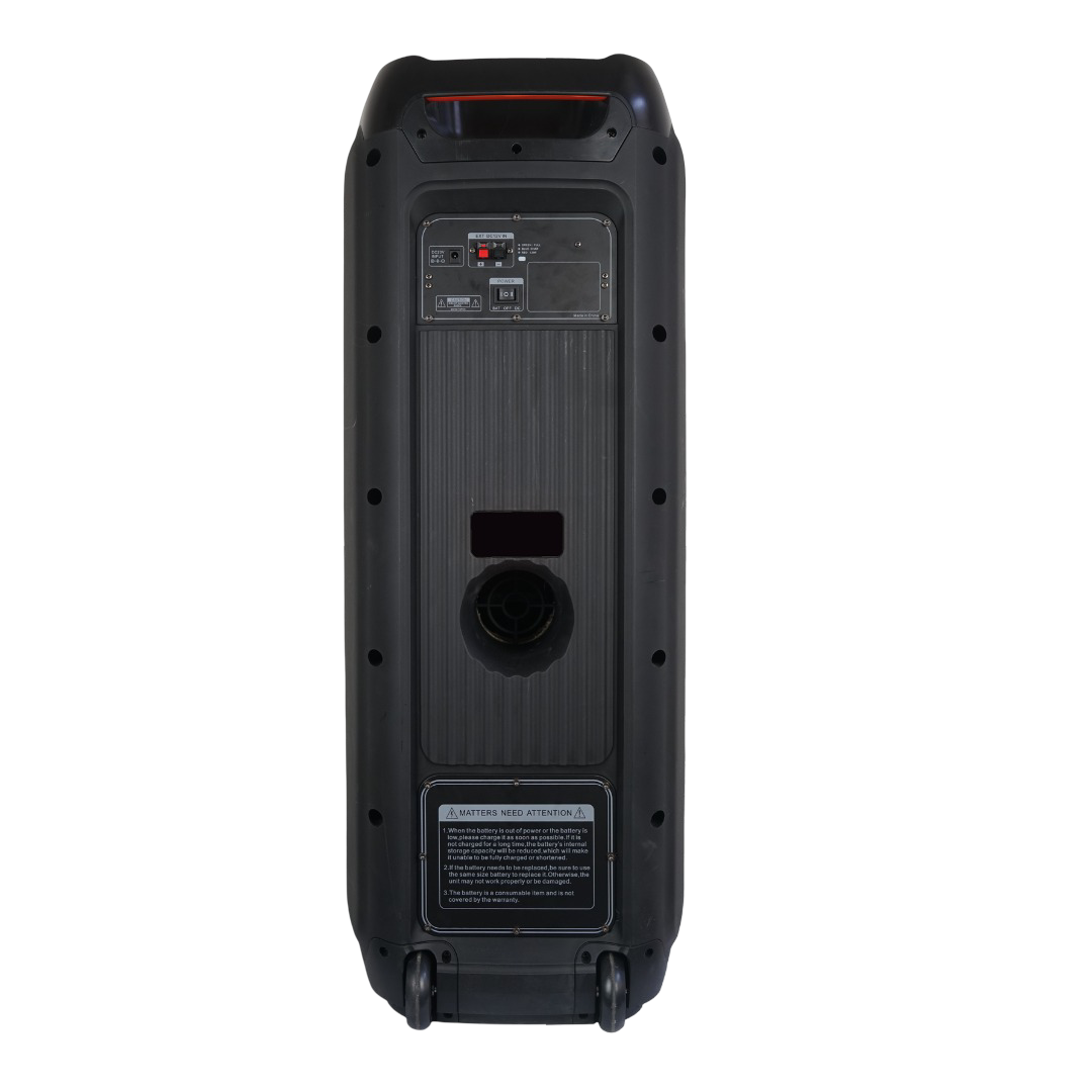 Subwoofer: 2×10 pulgadas. Luces LED. Puertos: USB/TF. Bluetooth. Radio FM. Entrada AUX/MIC. Control remoto full. Incluye 1 micrófono. Batería de ácido sólido 12V 7.5Ah/. Potencia 100W RSM Detalles 2: batería no retiene, solo para usar conectado 220v, falta micrófono y control, luz en colores no enciende todo, sonido al máximo se distorsiona un poco. Pasar al salón a probarlos