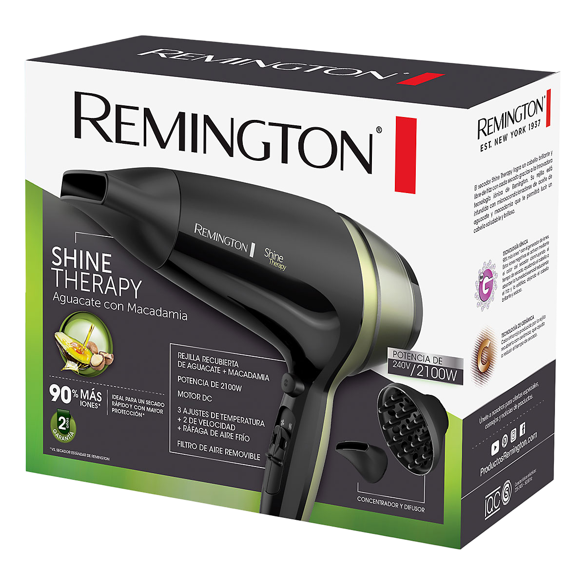 Resultados únicos. El secado Shine Therapyr logra un cabello brillante y sin frizz con cada secado gracias a la innovadora tecnología iónica de Remington. El aire caliente del secador, al pasar por la rejilla, libera microacondicionadores de raguacate con macadamiar y más cantidad de iones que un secador estándar.Logra resultados rápidos con mayor protección gracias a la tecnología iónica de Remington. Este secador emite un 90% más de iones y cuenta con una rejilla infundida con microacondicionadores de aguacate y macadamia permitiendo obtener un cabello brillante y libre de frizz.
